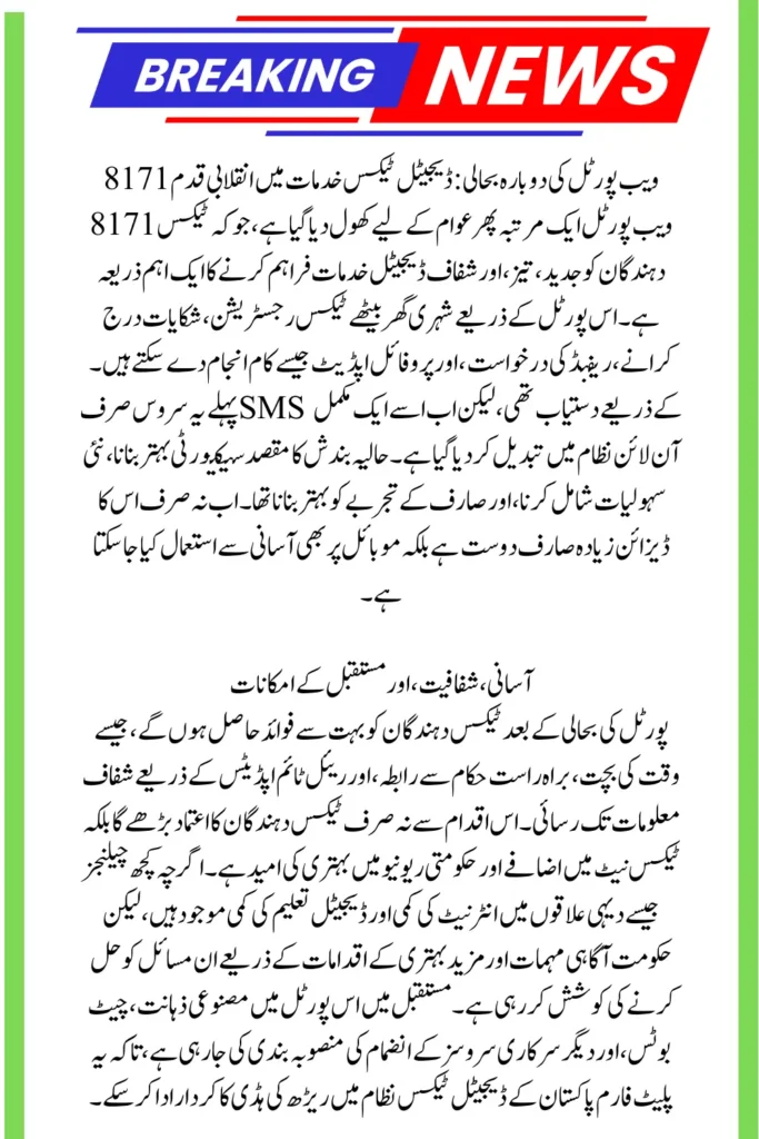 The reopening of the 8171 web portal marks a significant milestone in Pakistan’s journey towards digital tax administration. With enhanced features, improved security, and a user-friendly interface, the portal is set to transform how taxpayers interact with the Federal Board of Revenue. This initiative promises to make tax services more accessible, transparent, and efficient, benefiting both the taxpayers and the government.